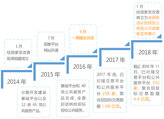 中國招標投標公共服務(wù)平臺(以下簡稱“國家平臺”)是國家發(fā)展和改革委員會聯(lián)合中國招標投標協(xié)會依據(jù)《電子招標投標辦法》(八部委20號令)推動建設(shè),并對接互聯(lián)全國電子招標投標系統(tǒng)交易平臺、公共服務(wù)平臺和監(jiān)督平臺,是為實現(xiàn)招標投標市場開放交互、動態(tài)聚合、公開共享、一體融合、立體監(jiān)督、公益服務(wù)目標的一體化信息共享樞紐,也是國家整合建立公共資源交易平臺的主要組成部分。隨著2018年1月1日起《招標公告和公示信息發(fā)布管理辦法》的正式實施,中國招標投標公共服務(wù)平臺被確定為全國依法必須招標項目的招標公告和公示信息法定發(fā)布媒介。